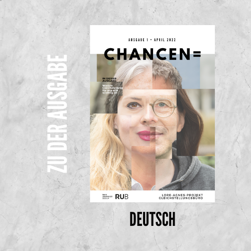 Unsere Gesellschaft lebt von ihrer Vielfalt! Diese Vielfalt an Menschen und Erfahrungen spiegelt sich jedoch in vielen Lebensbereichen nicht wider. Noch immer entscheiden bestimmte Merkmale, wie das Geschlecht einer Person, zu oft über ihre Chancen und Möglichkeiten. Daher möchten wir uns in dem Magazin CHANCEN= den Fragen widmen: Was bedeutet Gleichstellung? Welche Diskriminierungserfahrungen machen Menschen an der RUB? Und wie können wir Chancengleichheit erreichen?